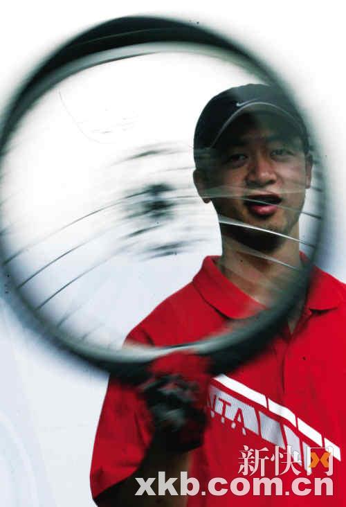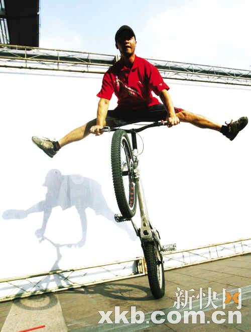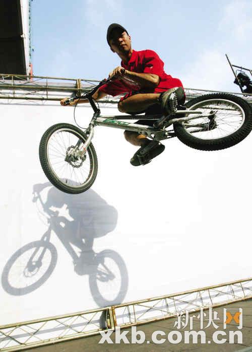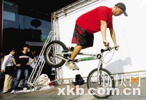 联系上钟腾飞,他正在北京路为安踏篮球赛事做推广活动。记者赶到现场时,阿飞正在场内炫技,几百名围观的市民均被他精彩表演所吸引,不时爆发出阵阵喝彩声。阿飞告诉记者,他玩自行车已有10年历史。“最初接触BMX是在16岁那年,当时我在电视上看到外国少年在玩,马上便被他们出神入化车技所吸引,并从此喜欢上这项运动。”阿飞说:“最初是父母反对我玩,觉得这是不务正业,但最后他们还是给我买了一辆车。”