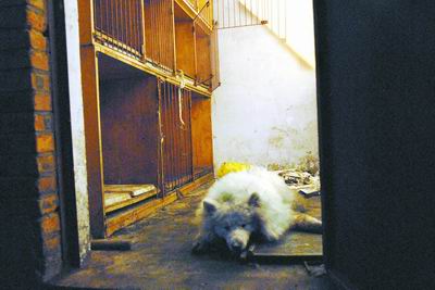 昨日下午,记者在位于花园路与畜牧路交叉口附近的康旭宠物医院,看到白色的萨磨耶狗趴在地上,头部不住抽动,鼻子发出重重的喘气声。