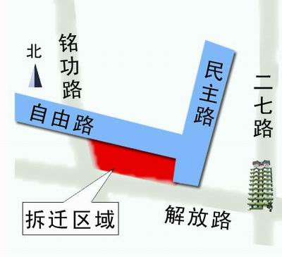 昨天,郑州市政府执行了物权法实施后的第一个强拆决定 二七商圈最后3栋民房被强拆