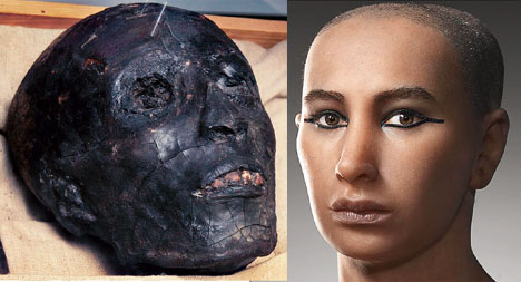 由于经过防腐处理加之年代久远,图坦卡蒙的面部肌肉早已萎缩干枯,如一层黑色皮革覆盖在头骨上,但是他的整个脸面完整无缺,光滑平整,还有明显突出的龅牙,这完全符合图坦卡蒙家族的相貌特征——牙齿咬合时上排门牙明显覆盖下牙。如果与法国、埃及、美国三国科学家在2005年根据电脑断层扫描(CT扫描)照片复原的图坦卡蒙长相比较,也会发现两者有着惊人相似。