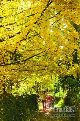银杏被称为活化石,是国家一级保护植物。“银杏叶可以提取酮,银杏果含有胺基酸等大量微量元素,可用来炖汤……所以说,银杏浑身都是宝。”老杨说,江东古老天然的银杏林,为开发古银杏生态旅游村提供了得天独厚的条件。