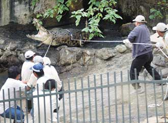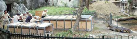 昨天上午九时,动物园保育员如临大敌,先将特制两座大长铁笼,以吊车安置到鳄鱼池区内;凶猛的咬人公河口鳄静卧水池,母鳄卧停在池边角落烂泥区,保育员先丢掷一只肉鸡诱食,观察已七天未喂食的公鳄反应,公鳄丝毫未理会。