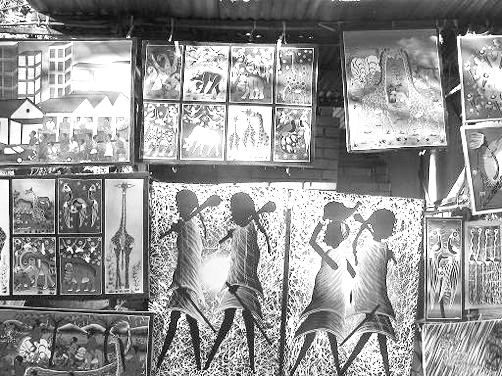 在市场的一角落,一家画店吸引了大家。店内绘画表现的大多数是非洲风情、非洲男女,浓重、强烈的色彩反差,描绘的人物、风景极具夸张。一些表现非洲妇女劳作的绘画,在写实中有浪漫,在夸张中有具象,每每给人一种强烈的美感。画家只用寥寥几笔就勾画出准确的线条,技法娴熟,色彩大胆富有想象力。在画店的一角,就是画家创作的场所。一块绷好的画布,画家用非洲特有的油彩作画,观众可以坐在旁边的椅子上,看画家如何调制油彩,如何很缓慢、很细致地一小笔一小笔在画布上涂油彩,全然不像中国的水墨画那样在纸上“挥毫泼墨”,转瞬间一幅画就画好了。一幅小小油画最少也要几天甚至几十天才能画完,如果想画得精到,画大一些的画,耗时几年十几年很正常。有一位同行看上了一幅油画,表现的是几个非洲女性在乞力马扎罗山雪峰下载歌载舞的场景,构图、色彩很不错,有一本杂志大小;开始店主要40美元,有点贵,她按来时朋友的交代砍一半,狠了狠心说:“10美元”。店主马上摇头,说“少了15美元不卖”,一下子就砍下25美元;看样子还能便宜点,她说“还是贵,不要了”,说罢转身就走,店主一看就说“最后一个价12美元”,她看看价砍得差不多了,就用12美元买下了这幅画。