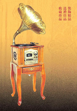 老一套老唱机仿20世纪30年代百代唱机风格,箱体选用实木制作,浅作雕刻,略加作旧。正面为仿青铜面板,侧面镂空出音(低音部分),纯青铜质地大喇叭(高音部分),与箱体后部连接。造型方正敦厚。原型今收藏于上海图书馆。当年克林顿夫妇访问上海时,专门挑选了在该原声唱机前合影留念。播放唱片、CD、磁带录放及收音功能。经典外型设计。