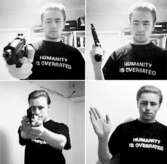 在短片中,凶手在一个无人的户外树林中练习射击,身穿一件印有“人类被高估了”字样的黑色T恤衫,瞄准不远处的黄色枪靶连连开枪。之后,凶手走向摄像机,面向镜头微笑了一下。