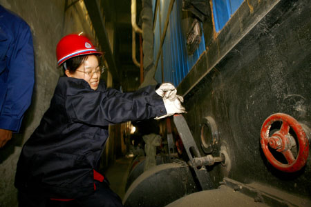 这里运输煤的煤廊有200米长,煤场里的煤经翻斗车运到上煤口,上煤口的筛子可以将大颗粒的煤分离出来,经过机器捣碎才能进入锅炉燃烧。在工人师傅的指导下,记者用尽全身力气将分煤器压下来,将飞速运来的煤挡住被分离到两侧的漏斗里。传送带传动速度非常快,经工人师傅及时提醒,我才注意到衣角差点儿绞进传送带里,心里着实有些后怕。