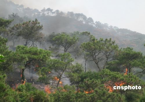 十一月十一日零晨广东鼎湖富廊村的北岭山林场布基工区发生山火,到十二日记者发稿时止,总过火面积约四千亩,现场东线桃园工区火势得到较好控制,但山火仍在全力扑救中,当地已调集二千五百人次扑救,并出动两架直升飞机从空中洒水弹灭火,暂未收到人员伤亡的报告。中新社发 黄耀辉 摄