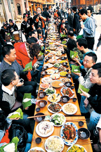 贵州千人长桌宴欢庆苗族新年 贝壳财经 新京报“贝壳财经”官方账号 2007.11.1302:23 关注 11月11日,在贵州雷山苗年文化周上,贵州省黔东南苗族侗族自治州雷山县西江镇千户苗寨举办长桌宴迎接各地游客。当地苗族同胞摆出近200米、可同时容纳1000余人就餐的长桌宴,庆祝一年一度的苗族新年。新华社发