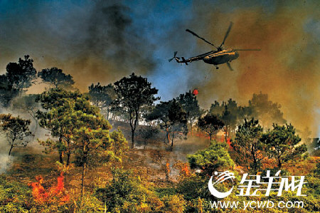 图:山火之上,直升飞机正在洒“水弹” 本报记者 施用和/摄