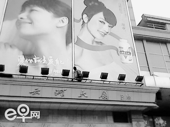 今天在华润超市的云河大厦,一位正在整理巨幅海报的工人,站在没有任何防护的灯架上挪来挪去,看得楼下的行人冒出一身汗。