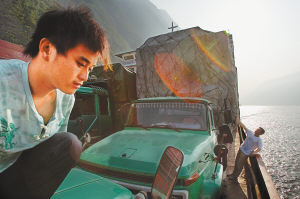 江苏盐城司机朱正飞(右)常年跑重庆,一趟七八天,可以挣个七八千元,“我这次拉了四票货,这段天气不冷不热,顺便带老婆、孩子看看三峡。”