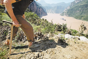 一位老农背着背篓走过长江三峡,山下一艘滚装船正在牛肝马肺峡中行驶。