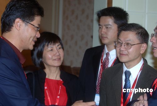 资料图片:由美国华裔精英人士组成的百人会2006年4四月20日在旧金山举行十五届年会,科学家何达一(右一)和网络领袖杨致远(左一)等著名年青俊秀欢聚一堂。中新社发 贾国荣 摄