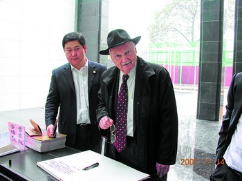 联合国前副秘书长莫里斯(右)为长沙市简牍博物馆留言后,还特别用中文书写了一遍。杨眺 摄