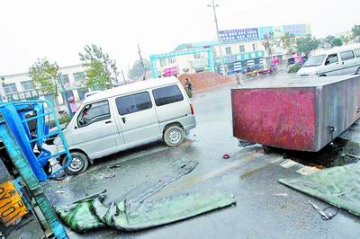 出租车司机蒲某惊魂未定地说,正在等绿灯时,突然感到车身被重重砸中。停车后,看到的情景让他非常后怕:“我的车尾部被甩下来的一个大油箱砸中,万一油箱砸中车的头部,恐怕我的命就没了!”