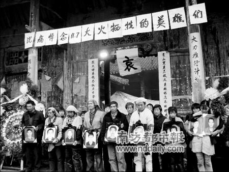 下午,宁远县政府官员第一次到公厅祭拜遇难者。“沉重悼念11?7大火牺牲的英雄们”的横幅以及一副挽联,也是在这时候挂上村公厅大门。