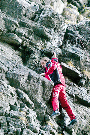 记者看见,“蜘蛛人”爬崖并不求快。每上爬一步,他都会用手先试试,看有无松落岩石,同时不停用腰、双脚转换姿势,直至找到最佳的攀爬姿势和立足点。每上一小平台,罗伯特都会稍加休息,并挥动双臂。叶俊称,由于气温太低,加上岩壁冰凉,罗伯特双臂很容易僵硬,他必须活动经脉。