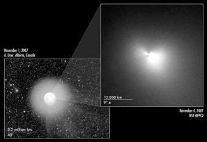始于10月24日的这次表演,使“霍尔姆斯”彗星从一个肉眼看不见的黑点忽然间变成了夜空中最明亮的物体之一。随着气体和尘埃物质以每小时1800公里的速度从彗核向外扩散,“霍尔姆斯”的亮度变得越来越暗。综合