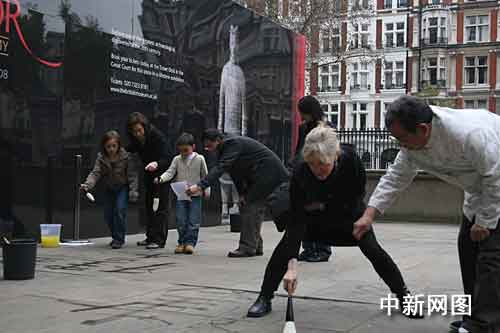 图为中国书法家云平(白衣者)在大英博物馆正门外,指导观众在地上“挥毫”。