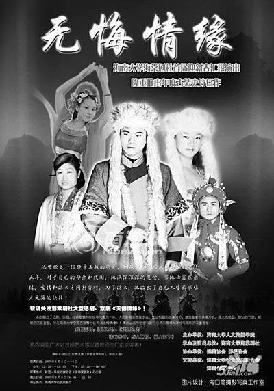 2007年8月,在北京举行的全国大学生戏剧节中,海南大学海棠剧社的剧目《无悔情缘》荣获优秀剧目奖。在北京演出期间,中央电视台戏曲频道还给他们做过专访。他们执着的追求、辛苦的排练,终于换来了观众的肯定与支持。
