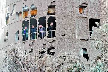 玻璃幕墙被炸烂,残留的玻璃遭泥浆覆盖。