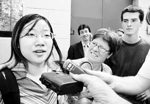 资料图:中国留学生李李(左)在离开凡尔赛羁押中心后接受记者采访。新华社发