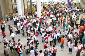 记者在现场看到,下午4时50分许,该校四(3)班的学生首先举着班别牌子在老师带领下列队出来,其他班级的学生也陆续列队来到了门内的露天空地上。5时许,校门打开,无需经过任何检查登记,记者随等候已久的家长涌进了校门,门口空地顿时变得拥挤而混乱,许多孩子追逐打闹显得十分兴奋。空地上随处可见学生搁置的书包,满地坐着待接的孩子,他们有的坐在书包上,有的则直接席地而坐。还有几个学生则直接摊开作业本,趴在地板上写起了作业。