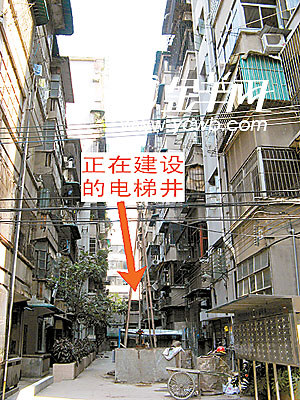 本报讯 记者蒋铮、实习生郑馨欣摄影报道:“本来就只剩5米宽的走道,再卡上一个3米宽的电梯井,消防车根本进不来,万一火烛怎么办?!”昨天,住在陈岗路2号大院21号的陈先生向本报投诉:隔壁楼房加建电梯,塞掉大半消防通道,造成里面4幢楼的消防隐患,还影响了隔壁楼的采光。而住在高楼的老人住户们,则坚持电梯一定要建。