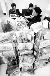 应记者要求,刘先生从一个绿色布袋里倒出几十扎捆绑好的零钱。这些是面额为5角和1元的纸币,新版、旧版都有,每捆都用白条封好,上面盖着红色的小印章。这些钱是从哪来?“银行来的。”刘先生说,他在银行有关系户,因此总能有办法兑换足够的零钱。他还称,逢年过节他都会给关系户送礼,“我一年送礼要花30多万元”。