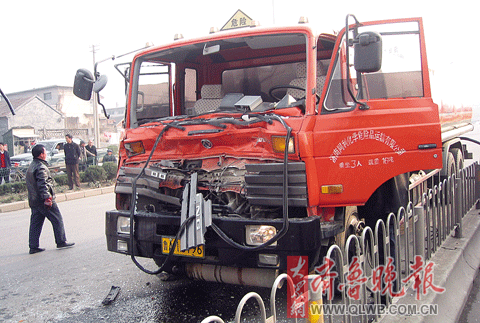 21日下午两点,记者赶到工业南路殷陈铁路桥南口看到,一辆轿车、两辆大货以及一辆油罐车依次由北向南挤在一起,玻璃碎片散落了一地。最前面的一辆轿车并无大碍,中间两辆大货有不同程度的损伤,而最后面的那辆油罐车,驾驶室严重变形(右图)。下午1点左右市民刘先生恰巧路过此处,突然听到刺耳的刹车声,他刚一扭头,又是一阵咣当乱响,四辆车挤成了一团。