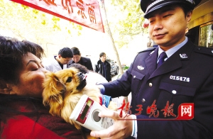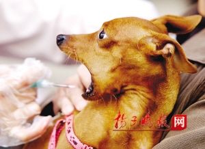 昨天上午10点钟,记者来到位于安德门警犬研究所的雨花台区养犬办证服务点。在注射室内,家住共青团路的刘女士抱着4岁的京巴狗“宝宝”等在一旁。为防扎针时狗狗咬人,宠物医生特意取出一个皮质口罩,准备将狗嘴套上。但由于“宝宝”十分不配合,医生和刘女士一连尝试几次,都被“宝宝”用爪子掀开。无奈,医生将“宝宝”放到一个铁笼内,“宝宝”不能动了,情绪更加紧张,发出嚎叫。站在一旁的民警立即像哄孩子似的,不停地说“‘宝宝’乖,一点不疼”。此招果然奏效,“宝宝”真的不叫了。随后,医生取出一次性注射器,在“宝宝”右颈部擦了酒精,插入“宝宝”皮下,轻轻一推,几秒钟就搞定了。
