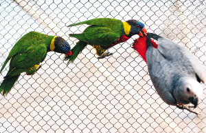 玩追尾游戏的吸蜜鹦鹉和非洲灰鹦鹉。