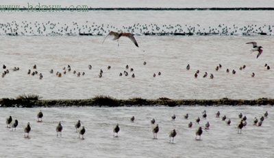 鸟类调查组昨天调查的两个地点分别在泉港区山腰盐场、后龙滩涂。在山腰盐场,调查人员发现了上万只不同种类的鸟儿集群在盐场栖息。栖息的鸟类虽然聚在一起,不过很明显地分出几个方阵,大杓(biāo)鹬、金斑鸻、黑腹滨鹬的群体都有保持10米左右的距离。