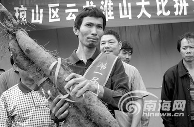 南海网11月23日消息:今天上午,一场别开生面的“琼山区云龙淮山大比拼”在云龙镇云龙墟举行,来自云龙、旧州、三门坡三镇的淮山种植专业户,每户精心挑选出一根最优淮山参加比赛。最终,云龙镇农民廖宝海种植的淮山以长106厘米、三围31.5厘米、重10.6公斤,综合评分第一,夺得琼山区首届淮山王的美称,并获得800元奖金。第二名吴多文种植的淮山长155厘米,是参赛中最长的淮山。