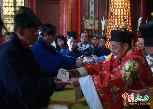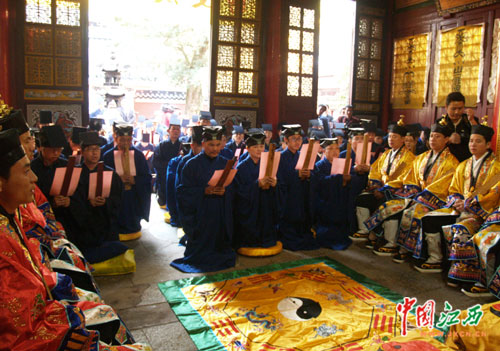 11月24日下午,240多名海外道教修道者汇聚鹰潭龙虎山天师府,参加传度授箓仪式。图为授箓醮仪的三师(传度师、保举师、监度师)。(中国江西新闻网记者 刘建明 摄)