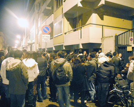 11月25日午夜大批华人云集佛罗伦萨总领馆门前排队等候申领护照。(意大利《欧联时报》)