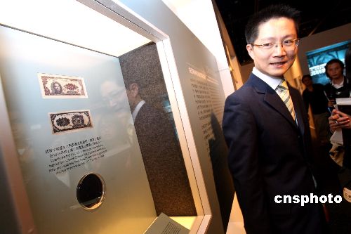 上海市银行博物馆馆长黄沂海介绍中国历史上面额最大的纸币,为图中1949年印制的带有孙中山像的六十亿元一张的纸币,当时这张货币在上海市仅能购买70粒大米,是中国金融系统崩溃,通涨最严重的写照。