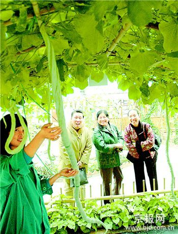 昨天,两名丰台世界花卉大观园的工作人员用绳子拴起2.6米长的印度蛇瓜,吸引了不少游客驻足观看。“绑扎在棚架上,防止蛇瓜接触地面影响路人行走。”据该园管理蔬菜瓜果的张师傅介绍说,2.6米长的印度蛇瓜刚刚长了两个月,单瓜就重达5公斤左右,形态狭长,外观恰似一条蛇吊在瓜架上。据介绍,蛇瓜喜温暖、耐高温,之所以能长这么长因为园内的良好环境和充足的阳光。印度蛇瓜除了观赏,还有独特的营养价值,食味佳,瓜质嫩爽脆。预计这根蛇瓜长度能超过3米。