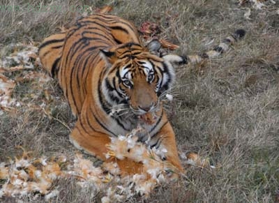 一位游客扔了一只活鸡到铁丝网内。鸡还没落地,就被一只老虎叼个正着,随即它将鸡摁在地上,用利牙拔鸡毛。不到两分钟,整只鸡就进了老虎肚中。