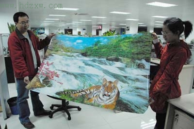 本报记者辗转从浙江义乌市民林先生手中,取得了网上众说纷纭的“老虎卧瀑图”年画。据林先生称,他看了媒体报道义乌厂家生产的老虎年画后,立即赶到厂家销售部,“当时销售部工作人员说库存只有5张,我2.5元一张就全买下了。”林先生说,厂方表示这些年画是2002年的库存。