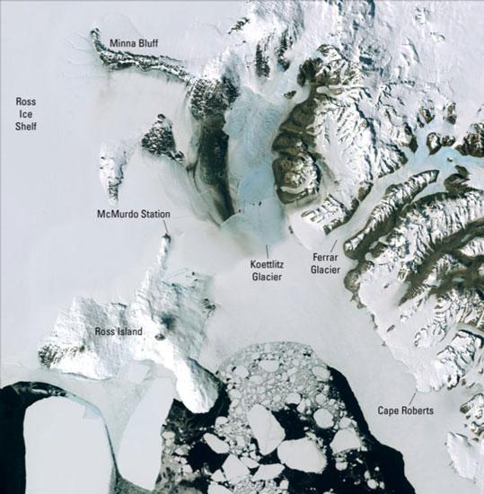 美国地球资源卫星拍摄的McMurdo南极站周围照片,空前清晰的显示出构成南极迷人世界的冰架、冰山以及冰河。