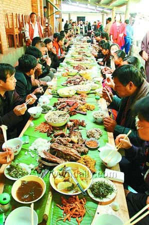 据一位佤族姑娘介绍,这还不算是真正意义上的“佤王宴”,传统的佤王宴是佤王(头人)坐立在长桌佤王宴的顶端一头,在佤王两旁是佤王宴请的尊贵客人。现在,由于宾主双方来的人数很多,所以佤王宴上就没有设“佤王”。在佤族人心里,佤王宴在菜品丰富程度上虽然与“满汉全席”无法相提并论,但佤王宴是佤族宴请尊贵宾客的最高礼节,因此佤族群众仍将它视为“满汉全席”。