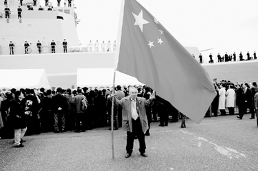 现年74岁的日本老人奥秋登在码头上以“深圳”舰为背景,举着一面五星红旗拍照留念。奥秋登告诉新华社记者,他从1999年至2002年曾在广东肇庆教日文,有很多中国学生。他说,几天前,中国学生通过电子邮件告诉他,中国海军军舰即将访问日本,今天他特地赶来在军舰前拍照,把照片发给学生,让他们分享自己的快乐。