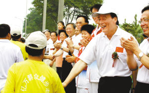 2005年6月19日,“国际体育运动年亿万群众健步走”活动中,群众主动向王岐山握手致意。资料图片