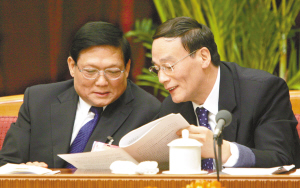 2006年3月5日,北京市委书记刘淇与北京市长王岐山(右)审议政府工作报告。资料图片 陈杰摄