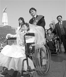 昨日下午4时,天府广场人山人海,穿着婚纱的残疾女孩王英微笑着向众人挥手,她说希望在这里寻找如意郎君。精致的妆容,精心的打扮,一件量身定做的婚纱让王英显出女性的妩媚。昨天与王英一同来游玩天府广场的还有另外16位残疾人。