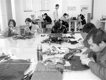 昨日中午,记者来到位于新华公园外的成都市残疾人庇护工场。工场内宽敞明亮,数张大桌子摆在其中,这是学员工作台。数十名康智(智障)者正认真工作,用小锤订线卡,用剪刀剪鞋面,或是作粘贴画。