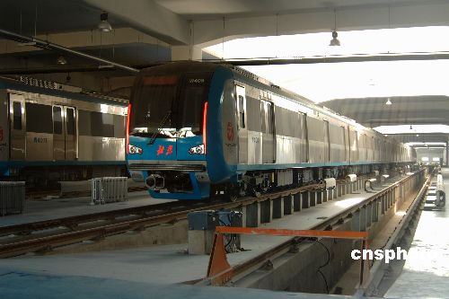 北京地铁10号线首批10列车辆12月3日凌晨开始陆续进入10号线万柳车辆段,并将在此完成车辆的例行实验和信号系统的车载设备实验,这项工作的完成也为10号线在奥运会前的按期开通和达到最小行车间隔3分半钟的标准创造了条件。北京地铁10号线一期及奥运支线是一条由西北至东南的轨道交通半环线,线路长24.55公里,车站22座。中新社发 王旭 摄