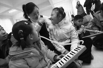 “唱到最后一句的时候,手应该是这样的……”王莹华老师边唱、边和学生们手把手地教利智学校的孩子做动作。这位刚在第五届全国中小学音乐课评比中获得了一等奖,成为全省第二个获此殊荣的音乐课老师说,她安排利智学校的孩子和班上的正常孩子同上一堂课,目的是想让这些孩子多接触一些智力正常孩子,同时,也培养智力正常孩子们与智力残疾孩子相互沟通等方面的爱心。如何面对一个智力有障碍的孩子?据了解,如今尽管有个别智力轻度残疾的学生随班就读,但多数孩子仍旧在专门学校学习。