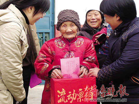 百岁老人投票选代表 大众网-齐鲁晚报 2007.12.0601:02 关注 郯城县县、乡(镇)人大代表近日实行了换届选举,胜利乡工作人员带着流动票箱来到前房庄村107岁高龄的李孙氏老人的家中,李孙氏老人(中)行使民主权利把自己的选票投入票箱,这是她第16次参加投票选举。杜明涵 摄